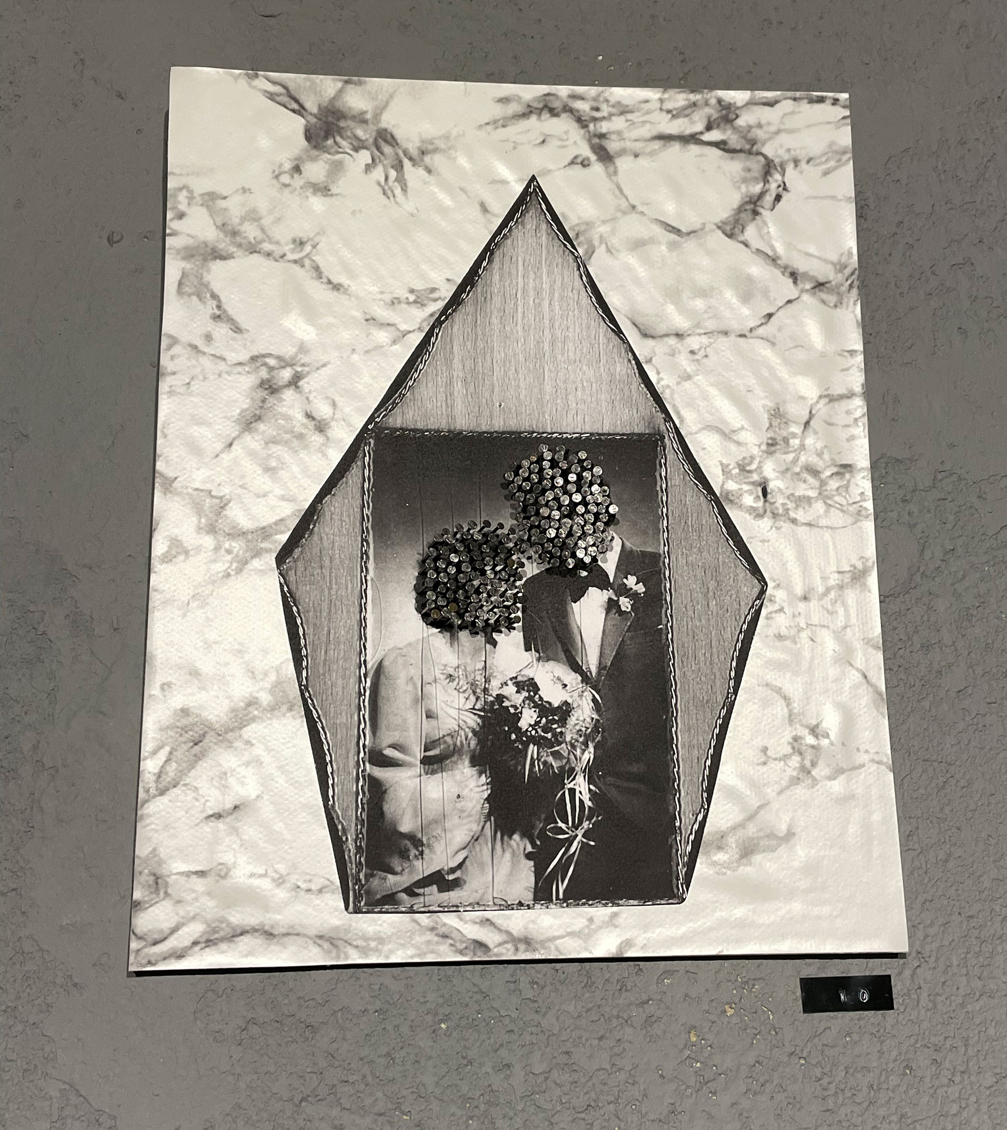 PVC, oilcloth with marble print, photocopy of a photo found at Gray Mandorla studio premises, nails