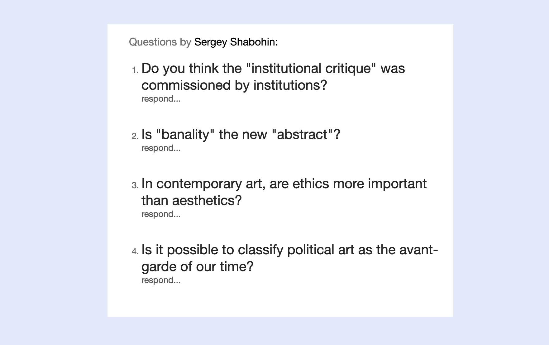 We invited artists to submit several questions that deal with conceptual or topical concerns relevant to their practice. For every question they submitted they were also asked to give possible answers. These questions and answers were compiled into an online questionnaire which anyone may view and answer. The entire project will be presented at the Amstel 41 gallery (see dates above) and we will also publish all documentation on the website after the exhibition.